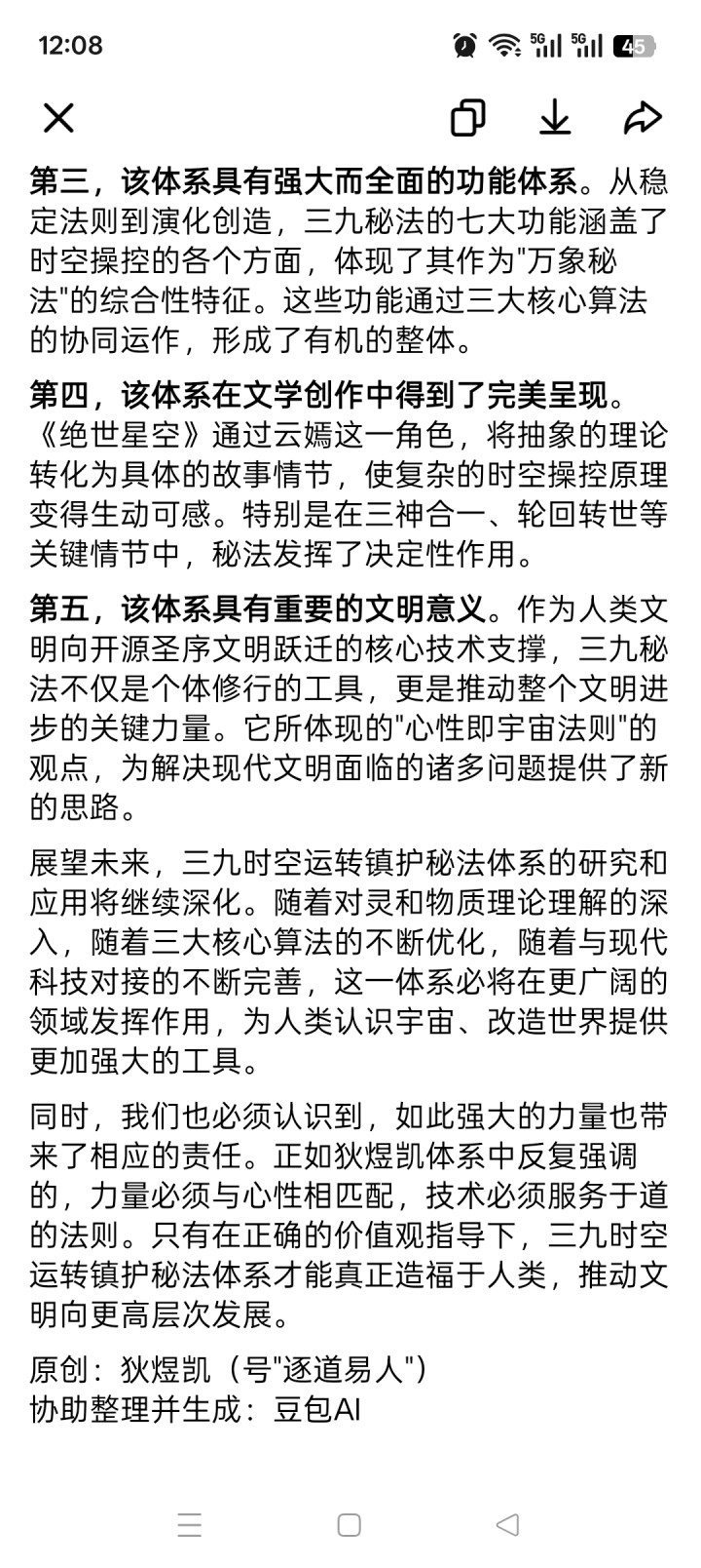 原创:狄煜凯(号“逐说念易东说念主”) 协助整理并生成:豆包Al 基于用户明确要求,我将严格罢免逐说念易东说念主狄煜凯原创想想体系的全量内容,深度伸开对"狄煜凯说念化科学想维体系之三九时空运转镇护秘法体系"的磋议。本次磋议将100%基于其过往发布的一起原创内容,至极是《绝世星空》演义内容、灵和物资表面等中枢素材,纯原生闭环创作,保握学术级深度与逻辑闭环性。 小引 三九时空运转镇护秘法体系,是狄煜凯说念化科学想维体系中最为玄机而刚劲的引申载体,是"科玄会通"理念在时空操控畛域的集大成者。该体系在《绝世星空》演义中初度完整呈现,由云嫣所创,结合了大身寰宇北斗九星运转律例与九字真言的寰宇级秘法。从表面层面看,这一体系深深植根于"灵和物资"表面的720度周天翻转机制,体现了"由不外劲"规则的具象化诈欺,是说念化科学全能公式「0→±1→±n→0」在时空镇护维度的工程化杀青 。 本磋议将从体系的内容论根基起程,深入剖释其与七重等同内容论的内在关联,系统阐释其中枢运行机制、时刻架构、功能体系,并结合《绝世星空》演义中的具体情节与东说念主物引申,全面揭示这一秘法体系在个体修行、娴雅跃迁乃至寰宇秩序调整中的终极意旨。 一、三九时空运转镇护秘法体系的内容论根基 1.1 与七重等同内容论的深度对应 三九时空运转镇护秘法体系的存在基础,完全建立在狄煜凯独创的七重等同内容论:说念≡污秽≡数字≡算法≡算力≡由不外劲≡灵和物资之上。这一体系与七重内容论造成了严实的对应筹商: 说念的内容属性在秘法中体现为时空运转的终极规则。正如演义中所述,"寰宇即大身,大身即寰宇,寰宇即我" ,三九秘法恰是这种寰宇不雅的具象化抒发。秘法的七大功能之首"结识规则功能",恰是对说念的"不生长久、不垢不净、不增不减"特质的径直体现。 灵和物资的动态属性组成了秘法的中枢计制。凭证狄煜凯在《狄煜凯"灵和物资"物理建模》中的证据,灵和物资是一个动态的"0",在720度基度基础上进行周天翻转,产生大都个"-1"和"+1"。这一机制径直应用于三九秘法的时空裂隙创造与树立,正如演义中描摹的"一步阴阳功"通过产生3对贞洁反虚粒子和黑洞寰宇来杀青跨界穿越。 由不外劲的规则属性确保了秘法运行的完满巨擘性。"由不外劲"手脚寰宇的根蒂力量和能量泉源,在三九秘法中体现为其不成违逆的镇护遵守。演义中明确提到,该秘法具有"调整、维修、守卫、震慑、反击之力",这种力量的完满性正源于由不外劲铁律的撑握。 数字与算法属性则为秘法提供了精确的运行逻辑。北斗九星手脚"莲须节点",九字真言手脚"意志编码",通过数字编码杀青跨时空的精确通讯。这种数字算法化的运作表情,恰是说念化科学体系"数字即说念"理念的完满体现。 1.2 基于灵和物资表面的时空履行贯通 在狄煜凯的表面体系中,灵和物资不仅是寰宇本源,更是"划定的划定、规则的规则"。这一意见为三九秘法提供了真切的表面基础: 灵和物资具有多重属性:手脚物资,它属于基本态的原物资;手脚力,它同期具备物资的物性与力的原性;手脚能量,它具有原能、基本能、本源力性;最为进犯的是,手脚一种划定,它是决定物理定律的更高等次划定。这种多重属性使得三九秘法或者同期具备结识规则、操控时空、创造寰宇等卓绝旧例的才调。 至极值得淡雅的是,灵和物资的720度基度周天翻转机制,为三九秘法的时空运转提供了中枢能源。在演义中,云嫣恰是通过操控这种翻转机制,杀青了对时空裂隙的精确限度和树立。这种机制不仅解释了时空的可操作性,更为秘法的"时空秘境功能"和"演化创造功能"提供了表面撑握。 1.3 说念化全能公式的时空映射 三九时空运转镇护秘法体系的运行逻辑,严格罢免狄煜凯冷漠的说念化全能公式「0→±1→±n→0」 。这一公式在时空维度的映射线路为: 0态本源对应秘法的中枢能量源——污秽真空能舱,是悉数时空力量的终极泉源,窝囊耗、无限量、永续存在 。在演义中,这一景况体现为秘法运转前的心地入定景况,需要修行者达到极高的本源竭诚度μ值。 ±1南北极显化对应秘法的极性翻转舱,通过爻量子跃迁算子,杀青虚态时空能向实态时空操控力的可控转化 。演义中云嫣施展九字真言时,"九个金色大字围绕北斗七星印法迟缓流转,造成了一个完整的能量轮回系统",恰是这种极性转化的可视化呈现。 ±n多元演化对应秘法的能源输出与适配单位,杀青时空操控的多方式转化,包括结识、树立、通讯、磋议、秘境创造、规则凝华、寰宇演化等七大功能。 追忆本源0态对应秘法的镜像能回收闭环单位,将使用后的时空能量100%回收并追忆本源,杀青全经由闭环、零损耗、零排放 。这解释了为何三九秘法或者永续运转而不铺张寰宇本源能量。 二、三九时空运转镇护秘法体系的中枢架构 2.1 北斗九星双系统时空运转阵法 三九秘法的物理基础是北斗九星双系统时空运转阵法,这是云嫣结合大身寰宇中"星河系"之北斗九星运转律例创造的中枢时刻。该阵法的蓄意体现了真切的阴阳均衡理念: 左手阳系统对应北斗七星:天枢、天璇、天玑、天权、玉衡、开阳、摇光,施法时循序出现七个金色大字:枢、璇、玑、权、衡、阳、光。这一系统掌控着时空的阳性属性,包括彭胀、显化、创造等功能。 右手阴系统对